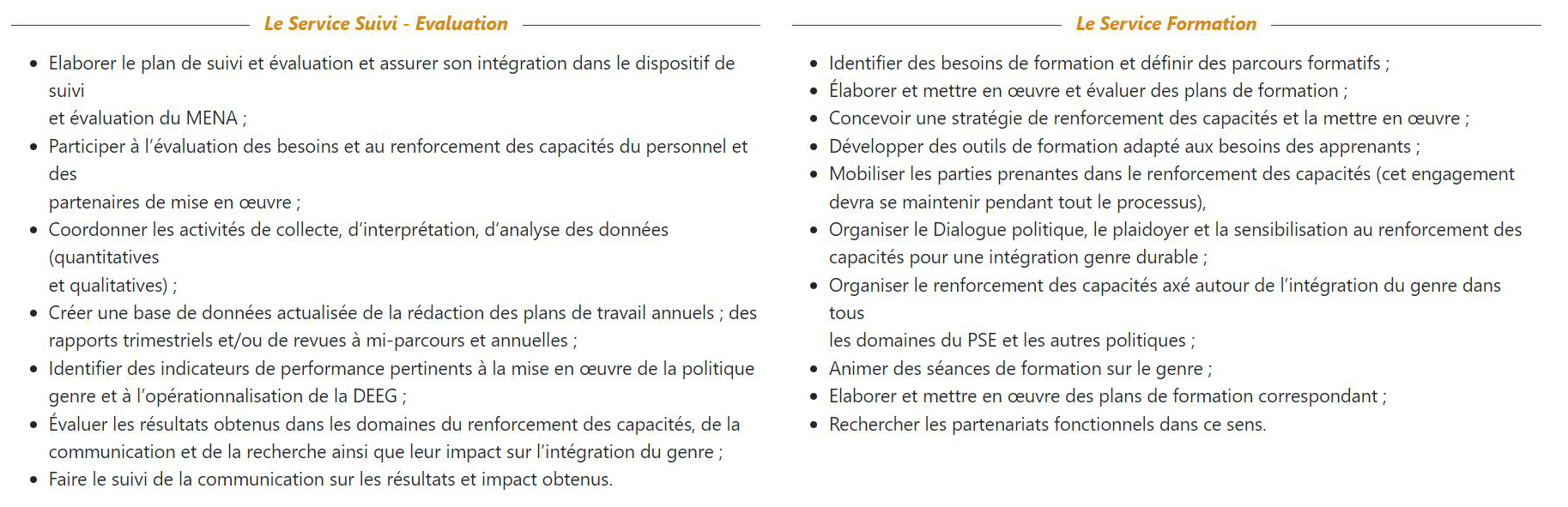 - Informer les départements du Ministère et les services des autres Ministères qui assurent la collecte et l'analyse des données de l'éducation et de l'emploi et de collaborer avec ceux-ci afin d'assurer un suivi et une évaluation des efforts du Ministère ainsi que d'améliorer l'égalité et l'équité du genre dans l'éducation et la formation