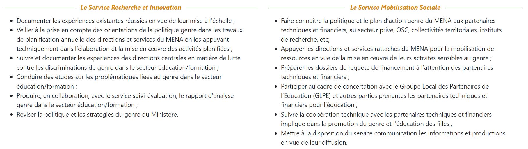 - Renforcer les compétences des départements ministériels et des parties prenantes clés dans le secteur Education/Formation sur les problématiques de scolarisation des filles et sur l'égalité et l'équité du genre