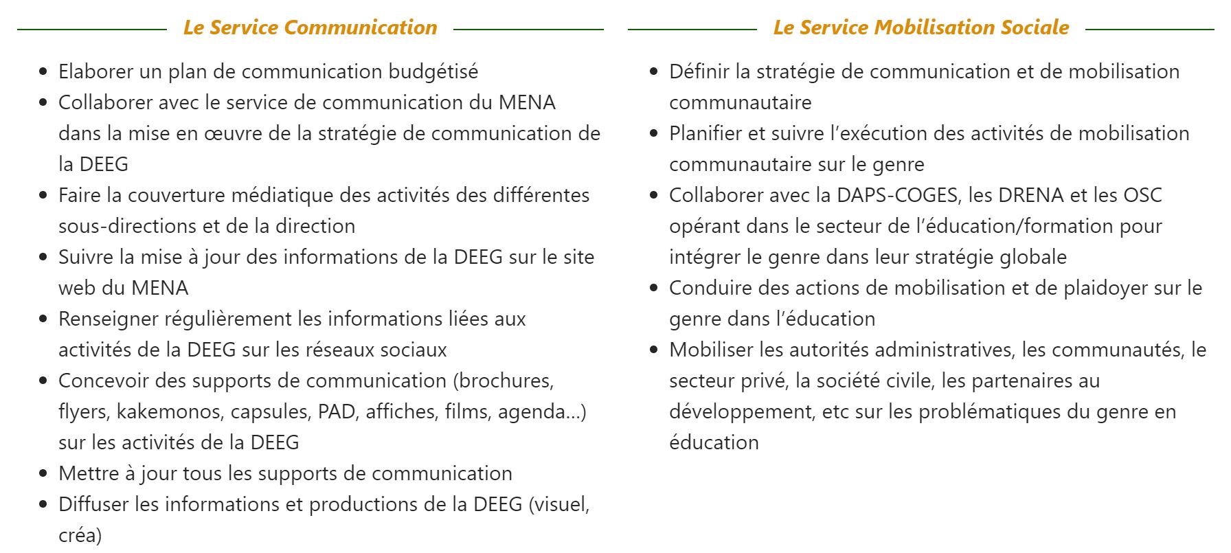 La sous-direction Communication et Mobilisation Communautaire sur le Genre ( CMC) est chargée de: